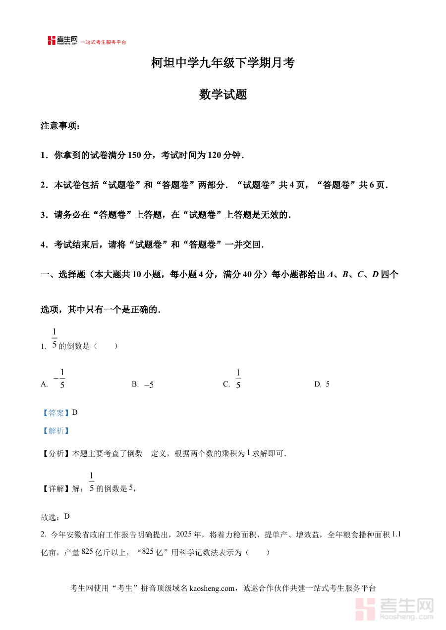 《精品解析:安徽省合肥市庐江县柯坦初级中学2024-2025学年九年级下学期3月月考数学试题(解析版)》是面向特定区域与学段的数学学习辅助资料,聚焦2024-2025学年安徽省合肥市庐江县柯坦初级中学九年级下学期3月的月考场景,属于初中数学学科阶段性考试的配套解析资料。该资料以解析版形式呈现,能够清晰传递本次月考的考查方向与内容框架,为使用者提供与考试直接关联的参考依据,帮助其快速把握该阶段数学学习的核心要求与考试特点。
