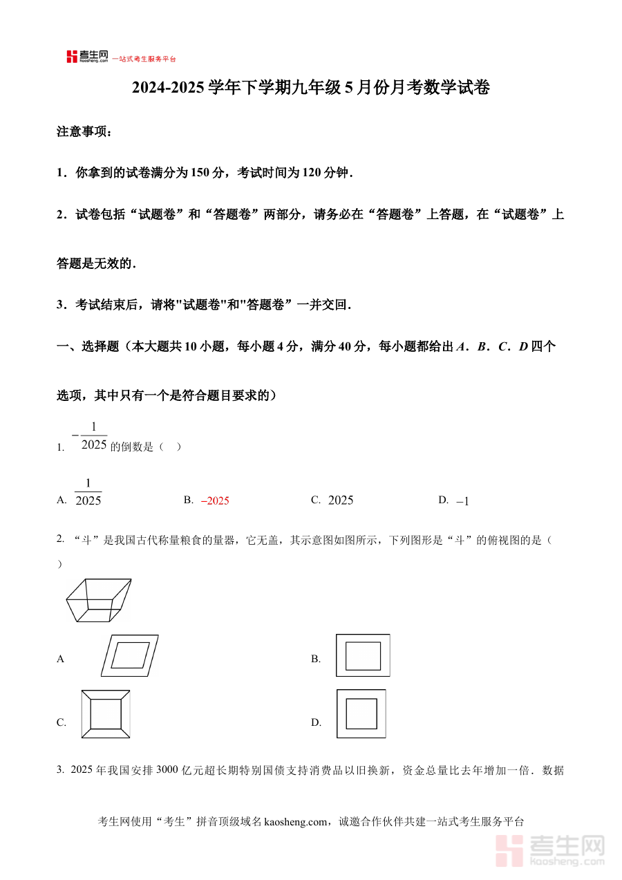 《精品解析:安徽省合肥市瑶海区众望初级中学2024-2025学年下学期九年级5月月考数学试卷(原卷版)》是一份聚焦特定学段与考试场景的数学备考资料,其覆盖年份为2024至2025学年下学期,地域范围指向安徽省合肥市瑶海区众望初级中学,考试类型为九年级5月数学月考的原卷版本。作为该阶段数学学习过程中的重要参考资源,它能够为使用者呈现该次月考的真实试卷结构与形式,帮助师生快速对接考试的具体要求,为后续的复习准备提供直接且贴合实际的依据。