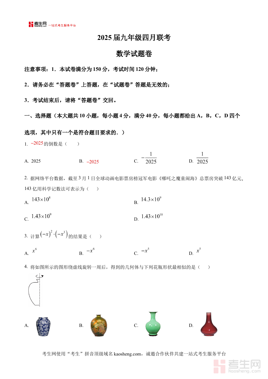 该原卷版试题卷主要用于九年级学生进行阶段性学习成果的自我检测与学情诊断,帮助学生及时识别自身在数学学习中的薄弱环节,为后续针对性复习计划的制定与备考策略的优化提供数据支撑;同时也为教师提供了了解学生阶段性学习状况的有效依据,助力教师调整教学节奏、完善复习方案,确保教学与备考方向精准对接联考及中考的核心要求。