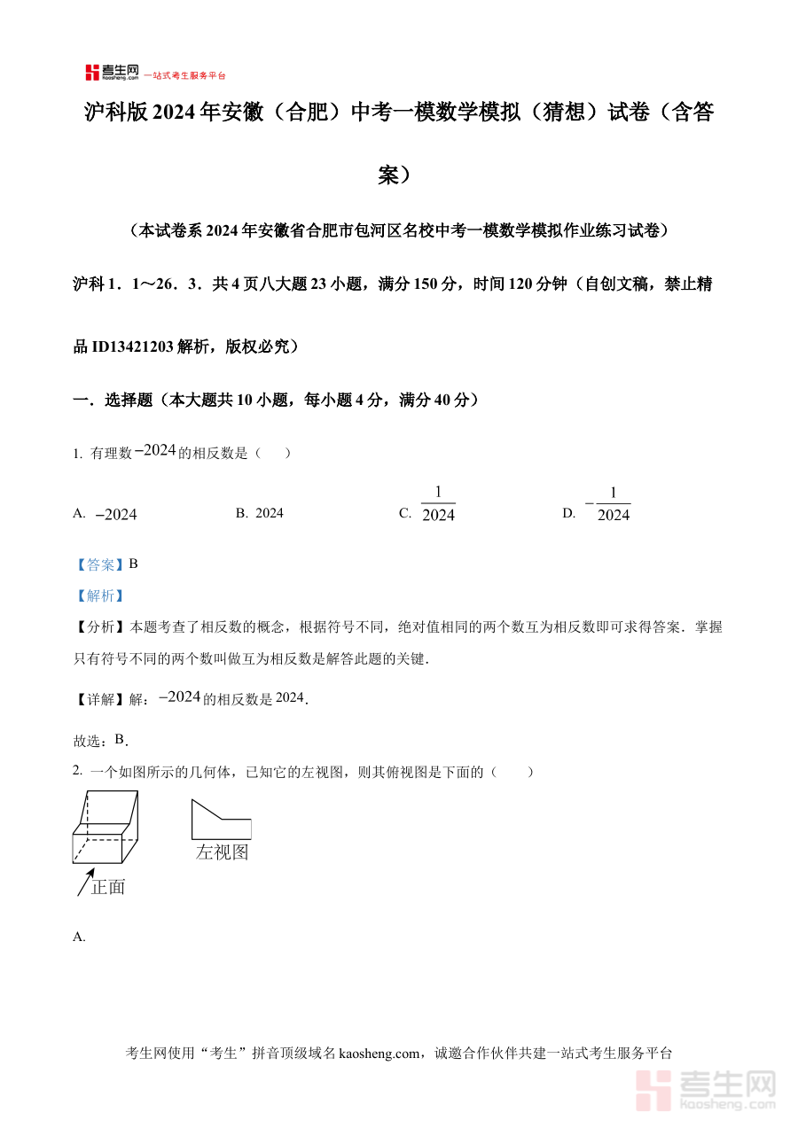 《精品解析:2024年安徽省合肥市中考一模数学模拟猜想试题(沪科版)(解析版)》是专门针对2024年安徽省合肥市中考第一次模拟考试设计的数学学科备考资料。该资料严格遵循沪科版教材体系编写,不仅包含了贴合本地中考一模命题方向的模拟猜想试题,还配备了详细的解析内容,为考生和教师提供全面且专业的备考支持。作为中考前重要的阶段性评估环节,合肥中考一模是考生检验自身学习成果、调整备考节奏的关键节点,而该资料正是围绕这一核心需求,旨在帮助使用者更好地应对这一阶段性检测。