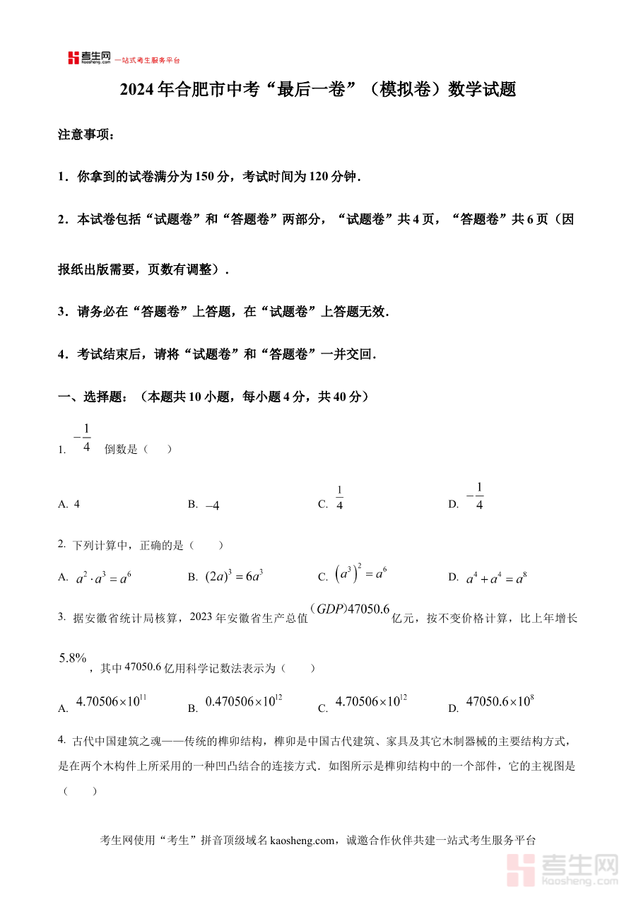 《精品解析:2024年安徽省合肥市中考数学模拟考试最后一卷 (原卷版)》是面向2024年安徽省合肥市中考数学科目的专项模拟备考资源,精准对接当地中考数学的命题趋势与考查方向,以“最后一卷”的定位为考生提供贴近真实考试场景的训练载体。作为原卷版资料,它完整保留了中考数学试卷的典型结构框架与呈现形式,能够让使用者直观感受考试卷面的布局逻辑与题型设置的整体脉络,为考前冲刺阶段的模拟训练提供原汁原味的体验。