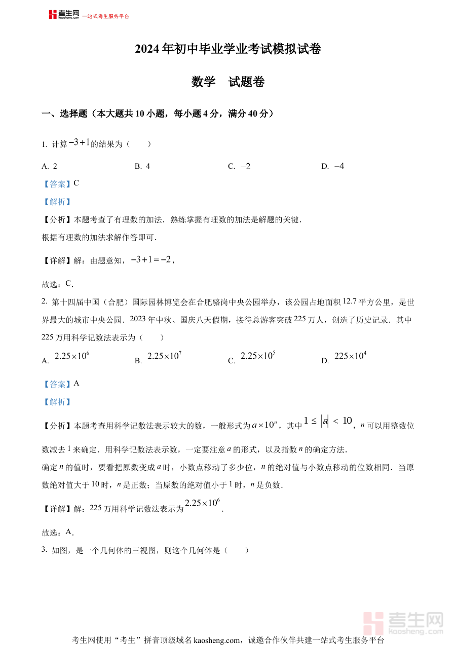 《精品解析:2024年安徽省合肥市新站区中考二模数学试题(解析版)》是针对2024年安徽省合肥市新站区初中毕业生设计的中考数学第二次模拟考试配套资料,属于中考备考过程中的关键阶段性资源。作为中考前重要的模拟测试载体,该资料贴合当地中考数学的命题趋势与区域教学实际,能够为考生提供与真实中考相近的考试体验,帮助其提前适应考试的时间安排与题型结构特点,是衔接日常复习与中考实战的重要桥梁,对考生熟悉考试流程、调整应试状态具有积极作用。
