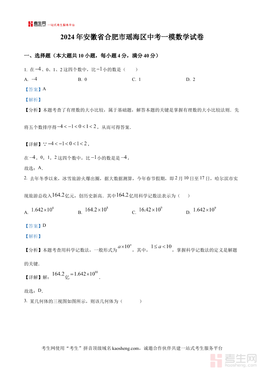 《精品解析:2024年安徽省合肥市瑶海区中考一模数学试题(解析版)》是针对2024年安徽省合肥市瑶海区初中毕业生中考前首次模拟考试数学科目的专业备考资料。该资料以当地中考命题导向为核心,结合瑶海区初中数学教学实际情况编制而成,为考生提供了对本次一模数学试题的全面系统解读,是中考备考阶段不可或缺的参考材料之一。它紧密贴合瑶海区中考备考的阶段性需求,旨在帮助考生熟悉模拟考试的题型结构与命题风格,为后续的中考复习奠定基础。