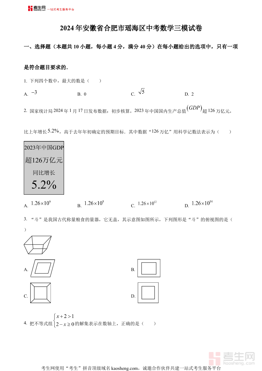 《精品解析:2024年安徽省合肥市瑶海区中考三模数学试题(原卷版)》是针对2024年安徽省合肥市瑶海区初中毕业生设计的中考前模拟检测资料。中考三模作为中考冲刺阶段的重要环节,是对考生前期复习效果的综合检验,而瑶海区作为合肥市教育资源较为集中的核心城区之一,其试题命制往往结合区域教学实际与中考命题趋势,具有较强的针对性和参考价值。原卷版的呈现形式能够完整还原考试的真实场景,包括试题结构、题型分布及作答要求等细节,帮助考生提前熟悉中考数学的考试形式与节奏。