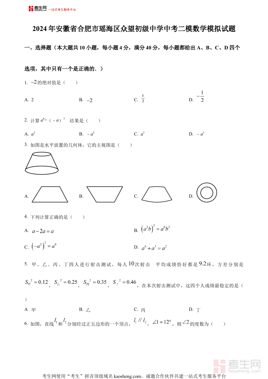 《精品解析:2024年安徽省合肥市瑶海区众望初级中学中考二模数学试题(原卷版)》是2024年安徽省合肥市瑶海区众望初级中学针对初中数学学科推出的中考第二次模拟考试原卷资料,属于初三学生中考备考阶段的重要阶段性检测材料。该资料紧密结合本地教学实际与中考命题趋势,为该校初三师生提供了贴合区域学情和考试要求的参考载体,有助于师生及时把握二模考试的整体框架与考查方向,是中考备考过程中不可或缺的阶段性资源。