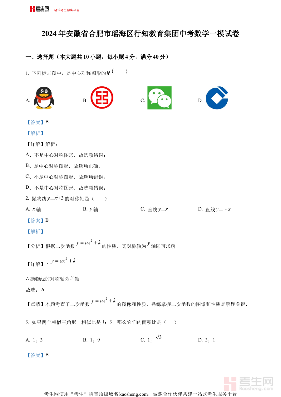 《精品解析:2024年安徽省合肥市瑶海区行知教育集团中考一模数学试题(解析版)》是针对2024年安徽省合肥市瑶海区行知教育集团举办的中考一模数学考试所编制的配套解析资料。作为中考前关键的阶段性备考资源,该资料能够为使用者提供与此次一模考试相关的专业解析支持,帮助使用者了解该集团范围内中考一模数学考试的命题背景和考查方向相关参考信息,是中考备考过程中具有较强针对性的辅助材料之一。