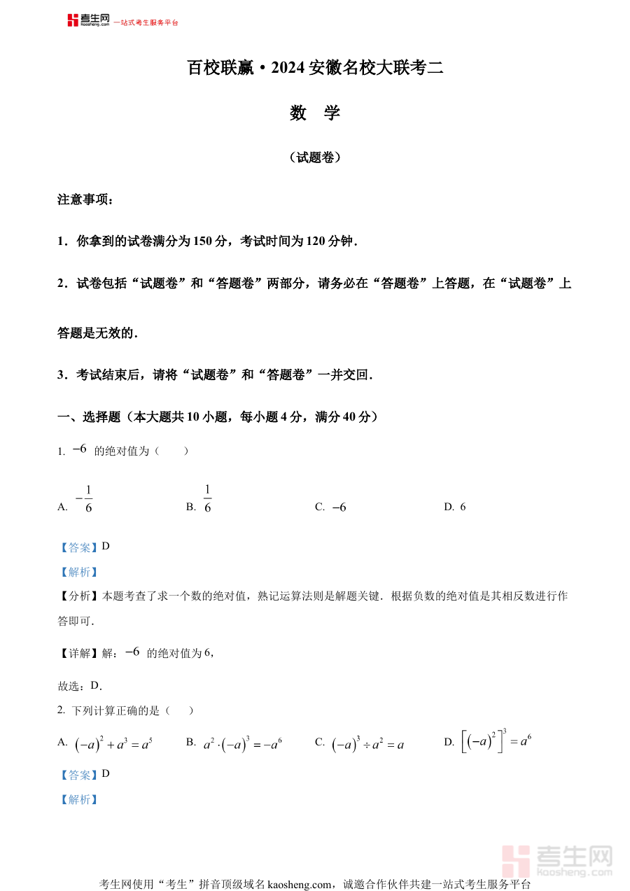 该资料适用于2024年参加高考的安徽省合肥市区域内高中学生,尤其是参与本次百校联赢名校大联考二模考试的考生群体,同时也适用于该区域内高中数学教师作为教学参考。其价值体现在通过专业解析为师生提供阶段检测后的反馈依据,助力考生在高考前关键阶段明确复习方向、强化薄弱环节、提升数学应试能力;也帮助教师更高效地开展针对性教学,推动整体备考质量的提升,为高考取得优异成绩奠定基础。