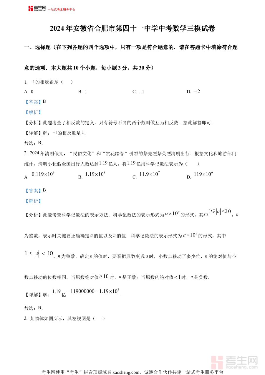 《精品解析:2024年安徽省合肥市第四十一中学中考三模数学试题(解析版)》是针对2024年安徽省合肥市第四十一中学中考前第三次模拟考试的数学学科解析类备考资料。作为中考前关键的阶段性评估环节,三模考试通常用于检验考生前期复习成果、模拟中考真实场景,本资料紧密贴合该校所在地区的中考命题趋势与教学实际,不仅提供了完整的模拟试题文本,更通过系统解析为考生搭建起从试题到知识点的关联框架,助力考生精准把握命题意图与考查重点。