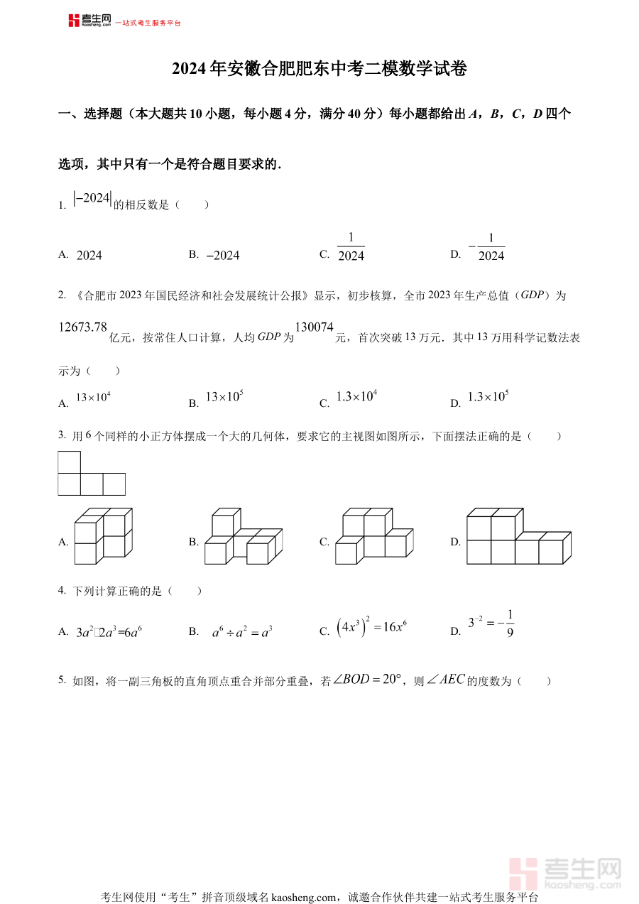 《精品解析:2024年安徽省合肥市肥东县中考二模数学试题(原卷版)》是针对2024年安徽省合肥市肥东县初中毕业生设计的中考第二次模拟考试数学学科原卷资料。该资料依托肥东县当地中考备考的阶段性安排,精准对应中考二模这一关键检测节点,为考生和教学人员提供了贴合区域命题特点的试卷资源,是中考备考过程中不可或缺的阶段性参考材料,能够帮助使用者直观了解本地二模考试的试卷结构与命题方向。