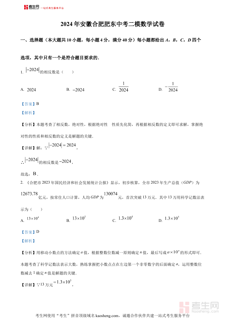 《精品解析:2024年安徽省合肥市肥东县中考二模数学试题(解析版)》是针对2024年安徽省合肥市肥东县初中毕业升学统一考试(中考)组织的第二次模拟测试所编制的数学试题及配套解析资料。作为中考备考进程中的关键阶段性资料,它紧密贴合肥东县本地中考命题的区域特点,能够为考生呈现该地区中考模拟考试的题型结构和考查方向,帮助考生快速熟悉本地模拟考试的命题逻辑与难度梯度,为后续的复习提供精准参考依据,助力考生提前适应中考模拟测试的整体节奏与要求。