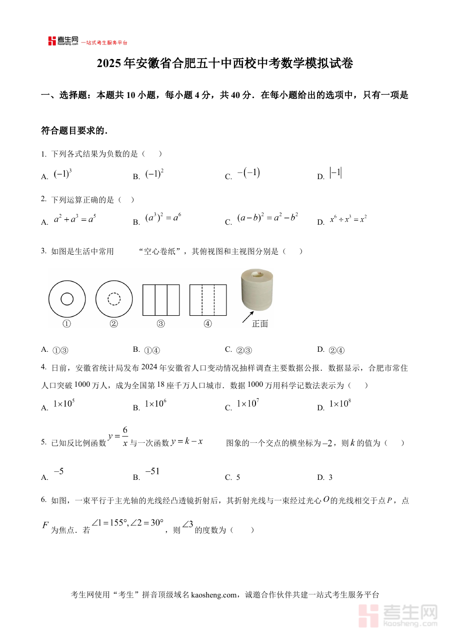 该试卷主要适用于2025年参加安徽省合肥市中考的数学考生群体,特别是那些希望通过高质量模拟练习提升应试能力、调整备考状态的学生。对于合肥五十中西校及周边区域的考生而言,这份试卷更贴合本地教学实际与中考命题的侧重点,能够帮助他们精准把握复习方向,强化对核心考点的理解与应用;同时,其他备考安徽中考数学的考生也可借助这份试卷了解区域命题特点,进一步增强应对中考数学的信心与准备充分性。