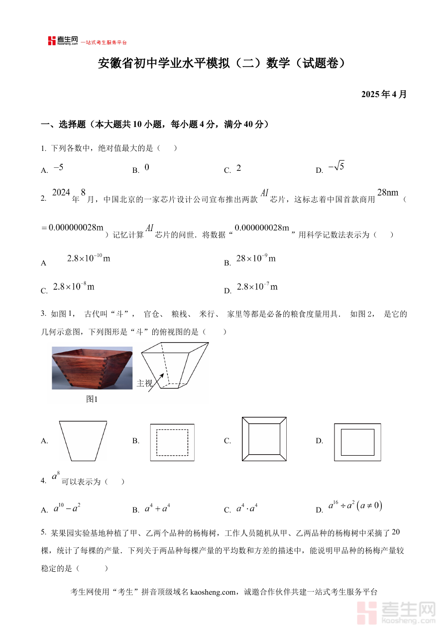 《精品解析:2025年安徽省合肥寿春中学九年级中考数学二模试题(原卷版)》是2025年面向安徽省合肥市寿春中学九年级学生推出的中考数学阶段性模拟试题资料。该资料紧密围绕当地中考数学的命题趋势与考查要求编制,依托寿春中学丰富的教学经验与教研资源,呈现出与实际中考二模考试高度匹配的原卷形式。作为中考备考关键阶段的重要资料,它旨在帮助学生提前适应中考数学二模考试的题型设置、题量分布与答题节奏,为后续的系统复习与针对性提升奠定基础,是九年级学生在中考数学备考过程中进行阶段性自我检测与能力提升的优质资源。