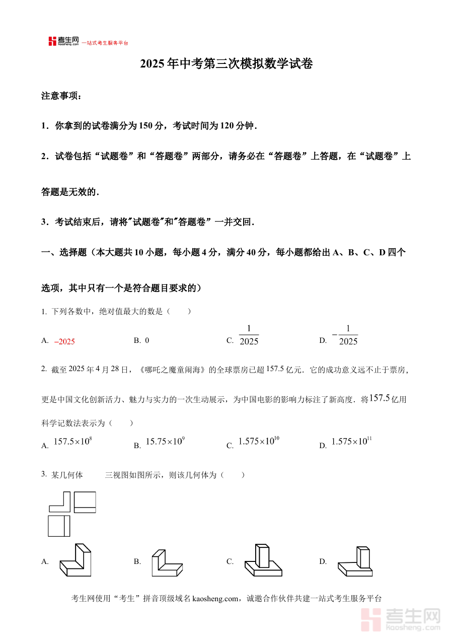 该资料主要适用于兴国实验学校初三阶段的数学考生,同时也可供安徽省合肥市及周边地区准备参加2025年中考的数学考生参考使用。作为中考前的关键模拟环节,第三次模拟试卷的练习价值在于帮助考生巩固前期复习成果,检验综合运用知识解决问题的能力,为最终的中考冲刺奠定坚实基础。通过对这份试卷的练习与分析,考生能够更有针对性地调整备考策略,增强应对中考数学考试的信心与实力,确保在正式考试中发挥出最佳水平,助力实现理想的中考成绩。