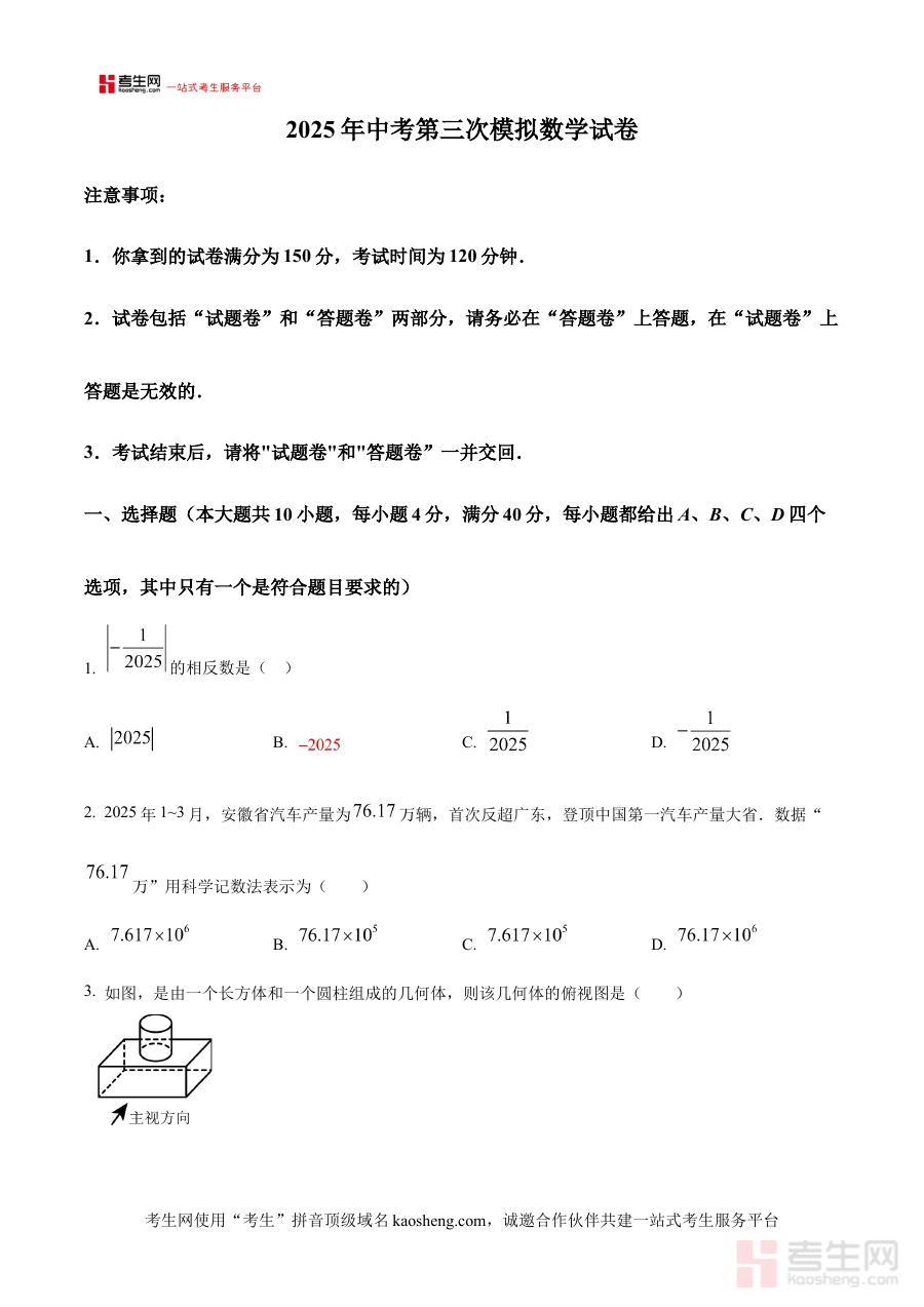 作为中考备考周期中承上启下的关键资料,该原卷版试卷主要服务于考生的阶段性学情诊断与自我认知提升。通过完成这份模拟试卷,考生能够系统检验自身对数学核心知识的掌握程度、解题方法的灵活运用能力以及考试时间分配的合理性,从而精准定位学习短板与薄弱环节,为后续的针对性复习计划制定与备考策略优化提供可靠数据支撑,有效提升冲刺阶段的复习效率与备考效果。