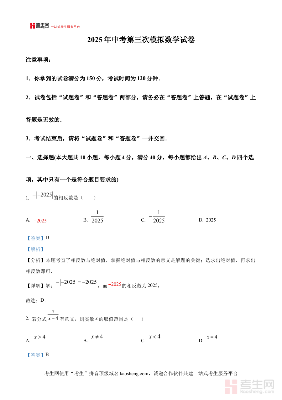 该资料适用于2025年安徽省合肥市即将参加中考的九年级学生,尤其适合厚德中学在读学生使用,也可作为其他同类学校考生进行阶段性检测的参考资料。它通过第三次模拟测试的解析内容,帮助考生在中考冲刺阶段进行系统的自我评估与查漏补缺,强化对数学核心知识的理解与运用能力,为最终的中考应试积累经验、提升信心,具有显著的阶段检测与备考规划价值。