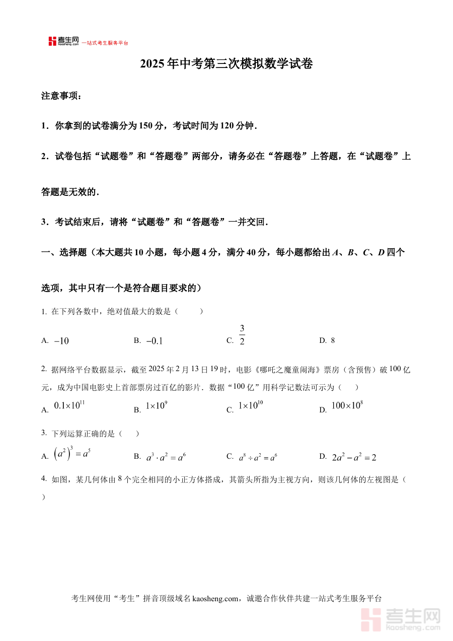 该资料适用于2025年即将参加安徽省合肥市中考的学生群体,尤其适合庆平希望学校及周边区域的考生使用。对于处于中考备考中后期的学生而言,这份第三次模拟试卷能够有效检验阶段性复习成果,帮助他们及时调整备考策略,强化知识薄弱点,积累实战经验,为最终的中考数学考试奠定坚实基础,具有较高的阶段备考价值与参考意义。