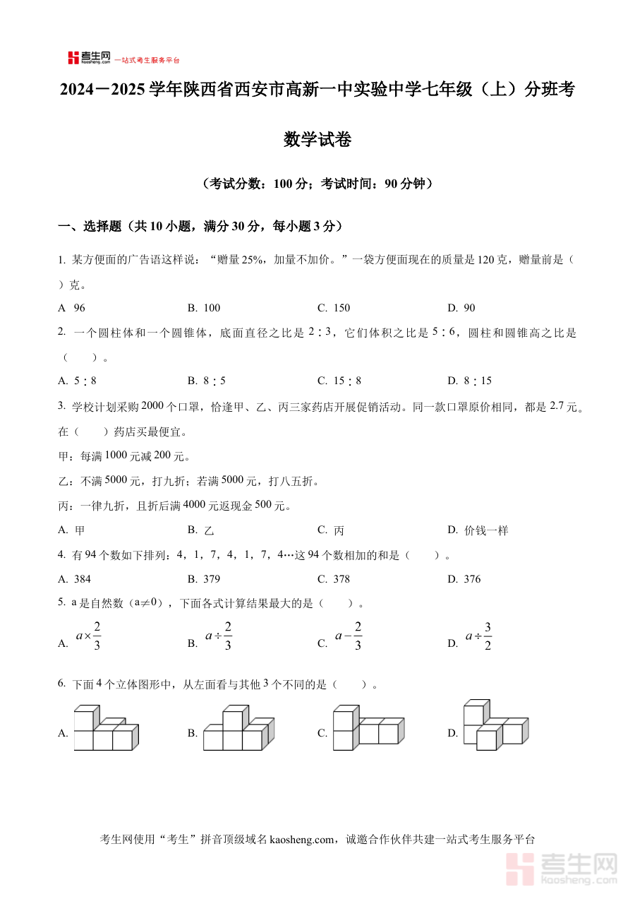 《精品解析:5.2024-2025学年陕西省西安市高新一中实验中学北师大版七年级上册分班考试数学试卷(原卷版)》是2024-2025学年面向陕西省西安市高新一中实验中学七年级新生的分班考试数学备考资料。该资料严格对应北师大版七年级上册教材体系,紧密围绕该校分班考试的核心需求,提供了与实际考试形式一致的原卷内容。通过这份资料,学生能够提前接触符合学校命题方向的考试载体,熟悉考试的整体框架与基本要求,为顺利应对分班考试做好前期准备,是衔接小学到初中数学学习阶段的关键参考工具。