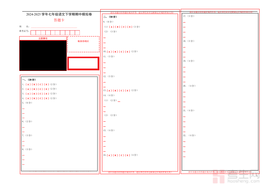 《七年级语文期中模拟卷(答题卡)(五四制专用)》是专门为实施五四制教育模式的七年级学生设计的语文期中模拟考试配套答题卡。作为期中阶段备考体系中的关键环节,它与对应的模拟试卷相互配合,为学生营造贴近正式期中考试的作答场景,帮助学生提前熟悉期中考试的答题格式、书写要求及答题卡的使用规范,确保在实际考试中能够高效、准确地完成作答。
