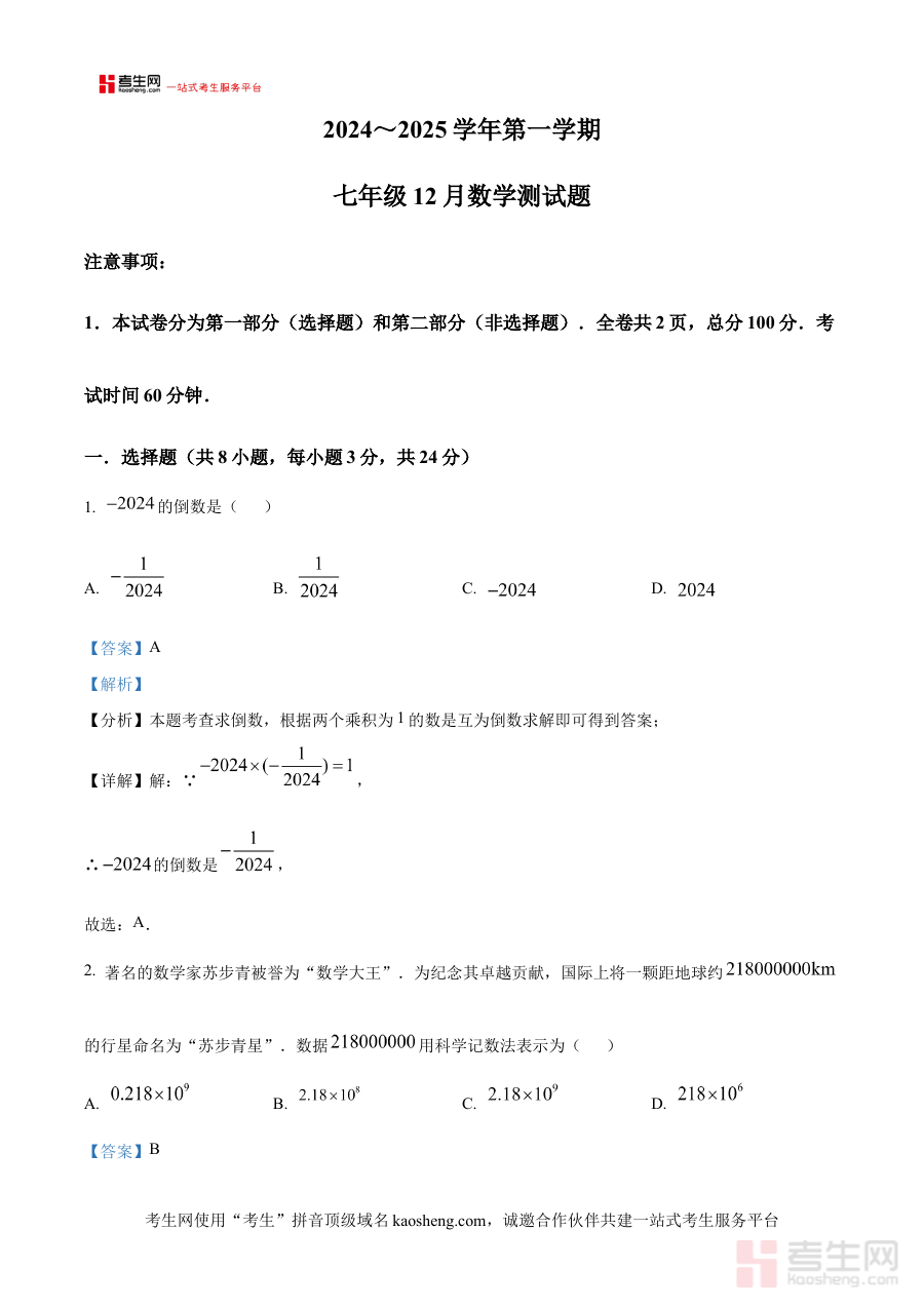 《精品解析:陕西省西安市西安交通大学附属中学2024-2025学年七年级上学期12月月考数学试题(解析版)》是针对陕西省西安市西安交通大学附属中学特定学年与学段的数学月考配套解析资料。该资料聚焦2024至2025学年七年级学生上学期12月份的校内月考数学科目,紧密贴合该校该阶段的教学进度与考试标准,为学生提供与校内实际考试直接对应的专业解析内容,是学生进行该次月考复习与复盘的重要参考材料,能够帮助学生快速对接校内考试要求,明确复习方向。