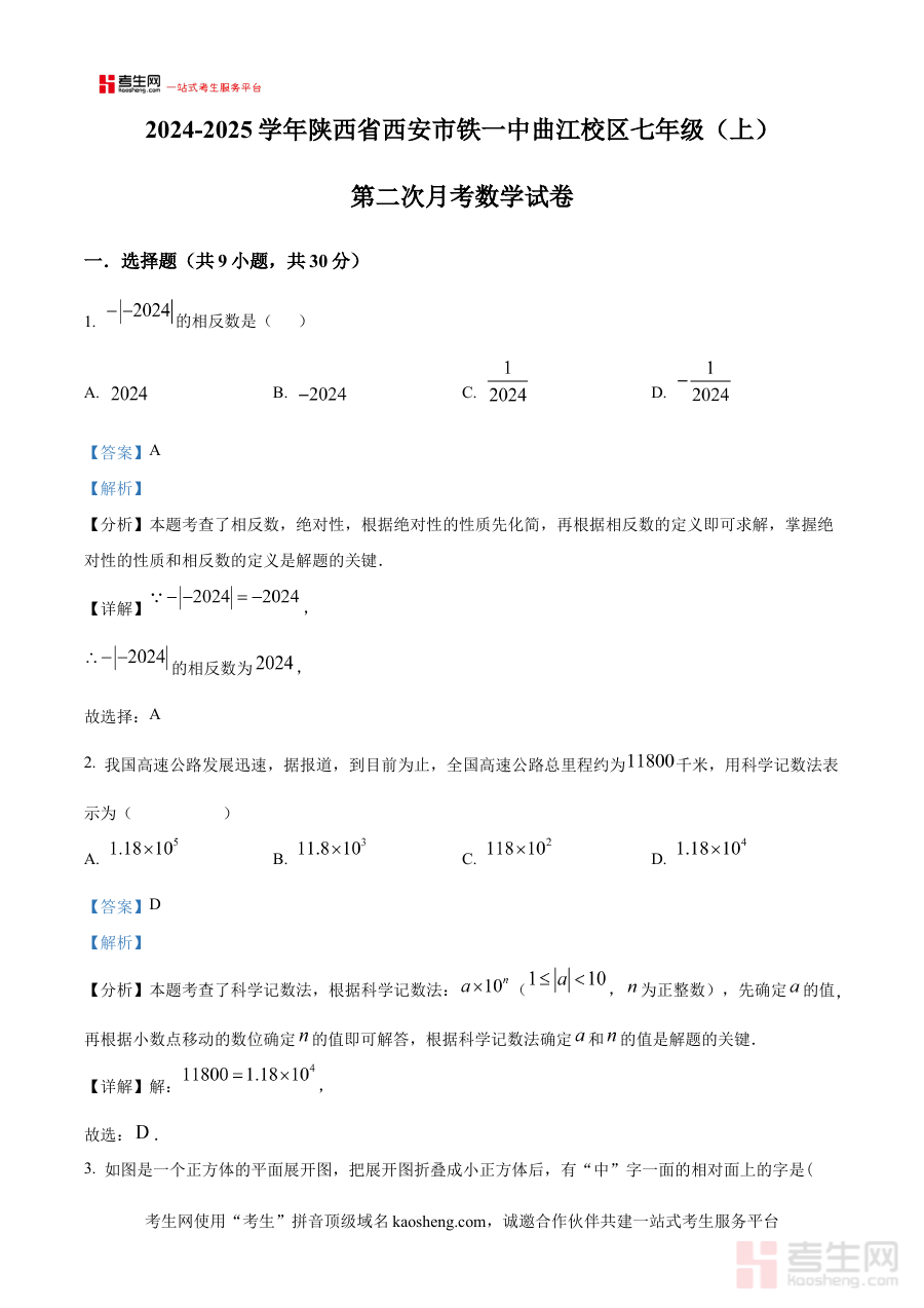 《精品解析:陕西省西安市铁一中曲江校区2024-2025学年七年级上学期第二次月考数学试卷(解析版)》是针对陕西省西安市铁一中曲江校区特定学年与学段的数学学科阶段性考试资料聚焦2024-2025学年七年级上学期的第二次月考场景为该校区学生提供了与本校考试直接相关的备考支持作为解析版资料它紧密贴合该校区七年级数学学科的教学进度与考试要求能够让使用者快速对接本次月考的考查背景与核心方向是针对该特定考试场景的专业备考资源