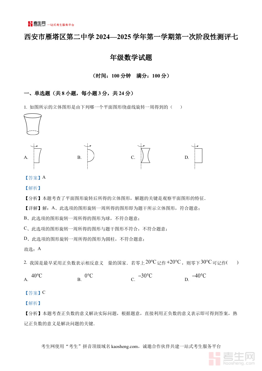 《精品解析:陕西省西安市雁塔区第二中学2024-2025学年上学期七年级数学第一次月考试卷(解析版)》是针对陕西省西安市雁塔区第二中学2024至2025学年上学期七年级学生数学学科第一次月考设计的备考资料。该资料紧密贴合该校七年级数学教学进度与月考考查方向,以解析版形式呈现,为学生提供了与实际考试场景高度匹配的练习与参考内容,确保使用者能够接触到符合本校教学要求的阶段性检测素材。