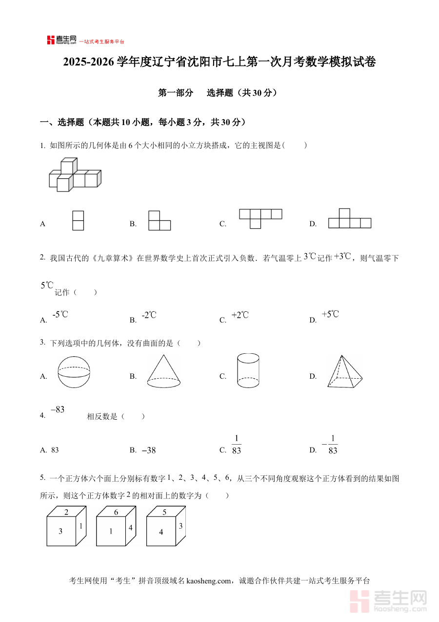 《精品解析:辽宁省沈阳市2025-2026学年七年级上学期第一次月考数学模拟(原卷版)》是面向辽宁省沈阳市2025至2026学年七年级学生推出的数学学科阶段性备考资料,紧密围绕该学年上学期第一次月考的考查范围与区域命题特点设计,旨在为学生提供贴合本地教学实际的模拟练习资源,助力其提前适应月考的考查形式与内容要求,为后续的学习与考试做好准备。
