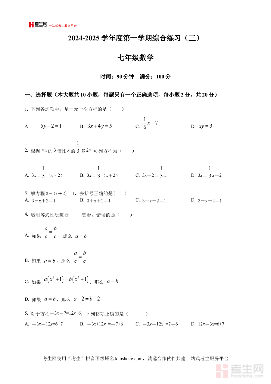 《精品解析:陕西省西安市高陵区张卜乡庙西中学2024-2025学年七年级上学期11月月考数学试题(原卷版)》是隶属于精品解析系列的阶段性数学考试资料,针对陕西省西安市高陵区张卜乡庙西中学2024至2025学年七年级学生设计,对应该校上学期11月份的数学月考。该资料保留了考试试题的原始结构与呈现形式,真实反映了该校在该阶段的数学教学进度与考查方向,为学生和教师提供了贴合本校教学实际的备考资源,是了解该校月考命题特点与阶段学习要求的直接载体,能够帮助使用者快速把握该校该阶段数学学习的核心重点与考查标准。