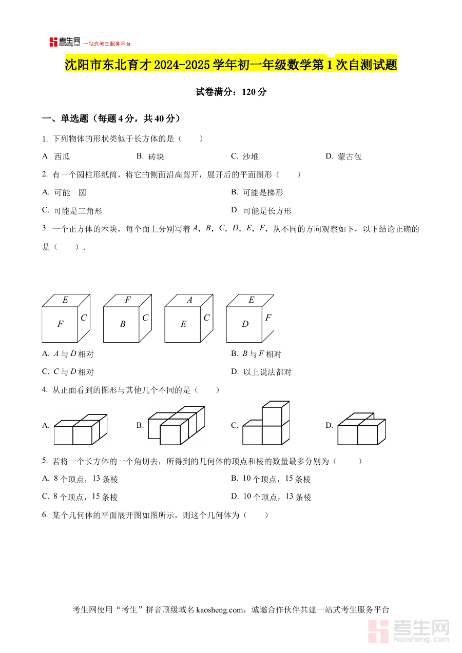 《精品解析:辽宁省沈阳市东北育才学校2024-2025学年七年级上学期第一次月考数学试题(原卷版)》是针对辽宁省沈阳市东北育才学校2024-2025学年七年级上学期第一次月考数学科目的备考资料,明确对应特定学年度、年级及考试节点,为使用者提供与该校月考直接相关的练习载体,帮助提前熟悉考试场景与节奏。