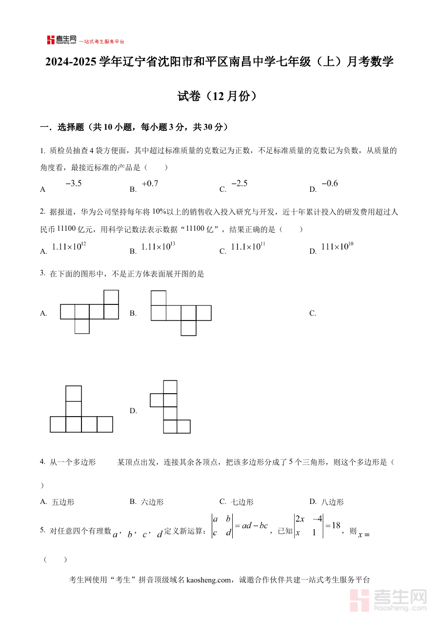 《精品解析:辽宁省沈阳市和平区南昌中学2024-2025学年七年级上学期月考数学试卷(12月份)(原卷版)》是针对辽宁省沈阳市和平区南昌中学2024至2025学年七年级上学期12月份月考数学科目的备考资料,聚焦该阶段学校自主组织的阶段性测试需求,为学生提供贴合校考实际的练习载体。