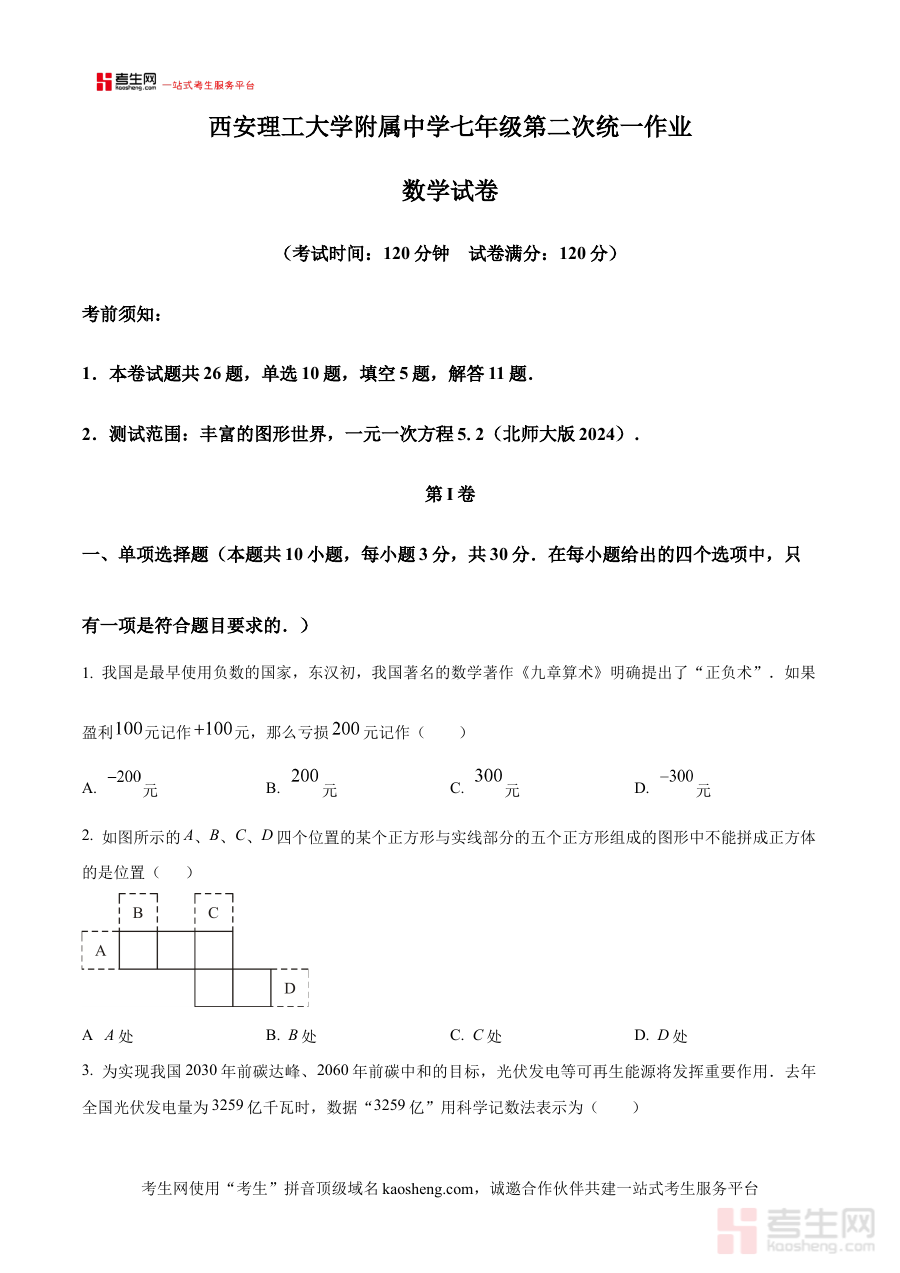 《精品解析:陕西省西安理工大学附属中学2024-2025学年上学期12月月考七年级数学试题(原卷版)》是针对陕西省西安理工大学附属中学2024至2025学年第一学期七年级学生12月月考的数学学科原卷资料,属于阶段性学业检测类备考资源。该资料严格对应学校当学期的教学进度与阶段性考查要求,能够为学生提供贴合校内实际考试场景的练习载体,帮助使用者提前熟悉月考的命题框架与考查方向,是七年级数学学科阶段性学习成果检验与备考准备的重要参考材料。