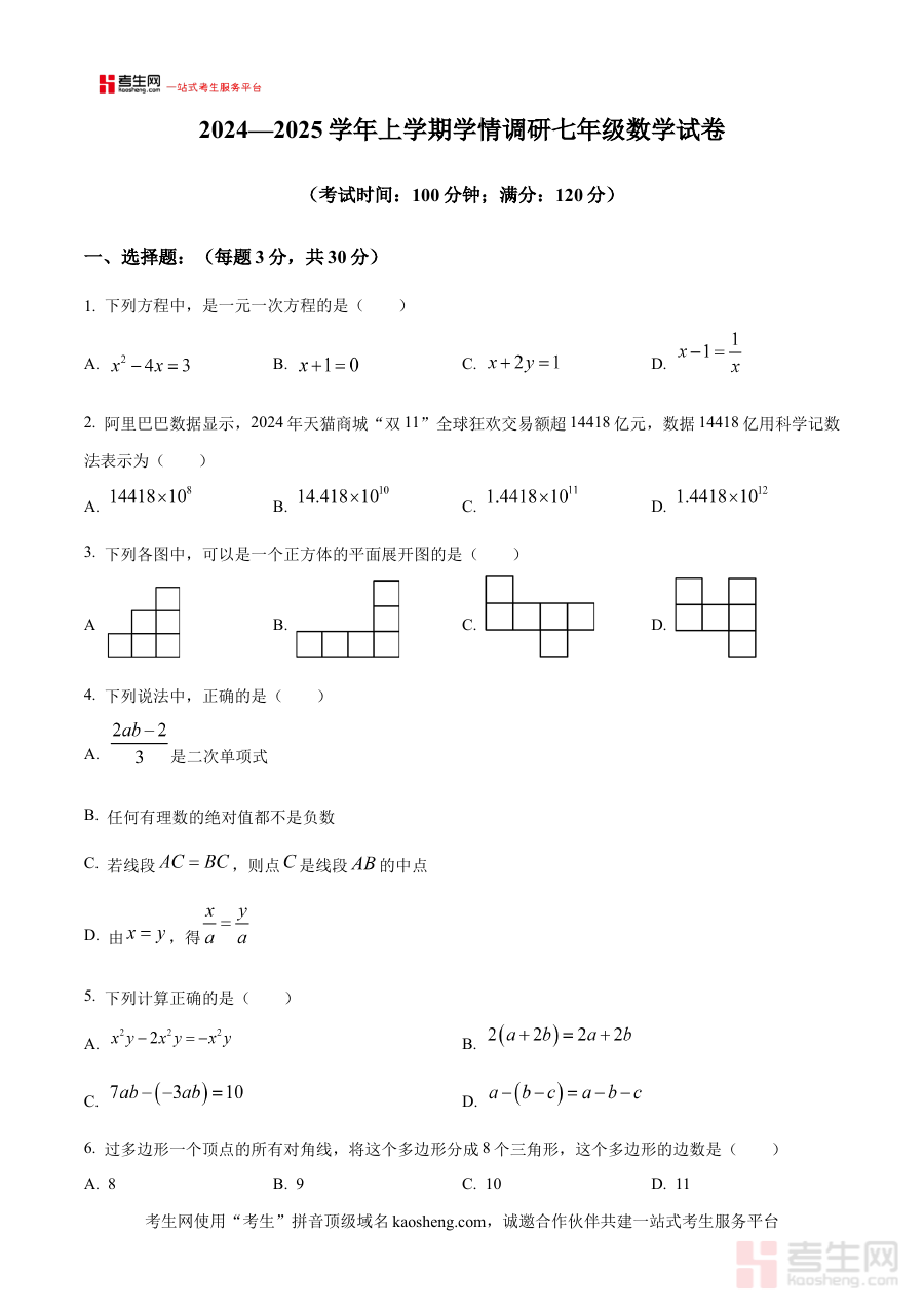 本资料主要适用于河南省郑州市第七十三中学2024-2025学年七年级的学生及数学教师,也可为同地区同年级其他学校师生提供阶段性调研考试的参考范例;其核心价值在于通过原卷形式还原考试场景,辅助师生进行阶段学习效果评估与备考规划,提升阶段性学习的质量与效率。