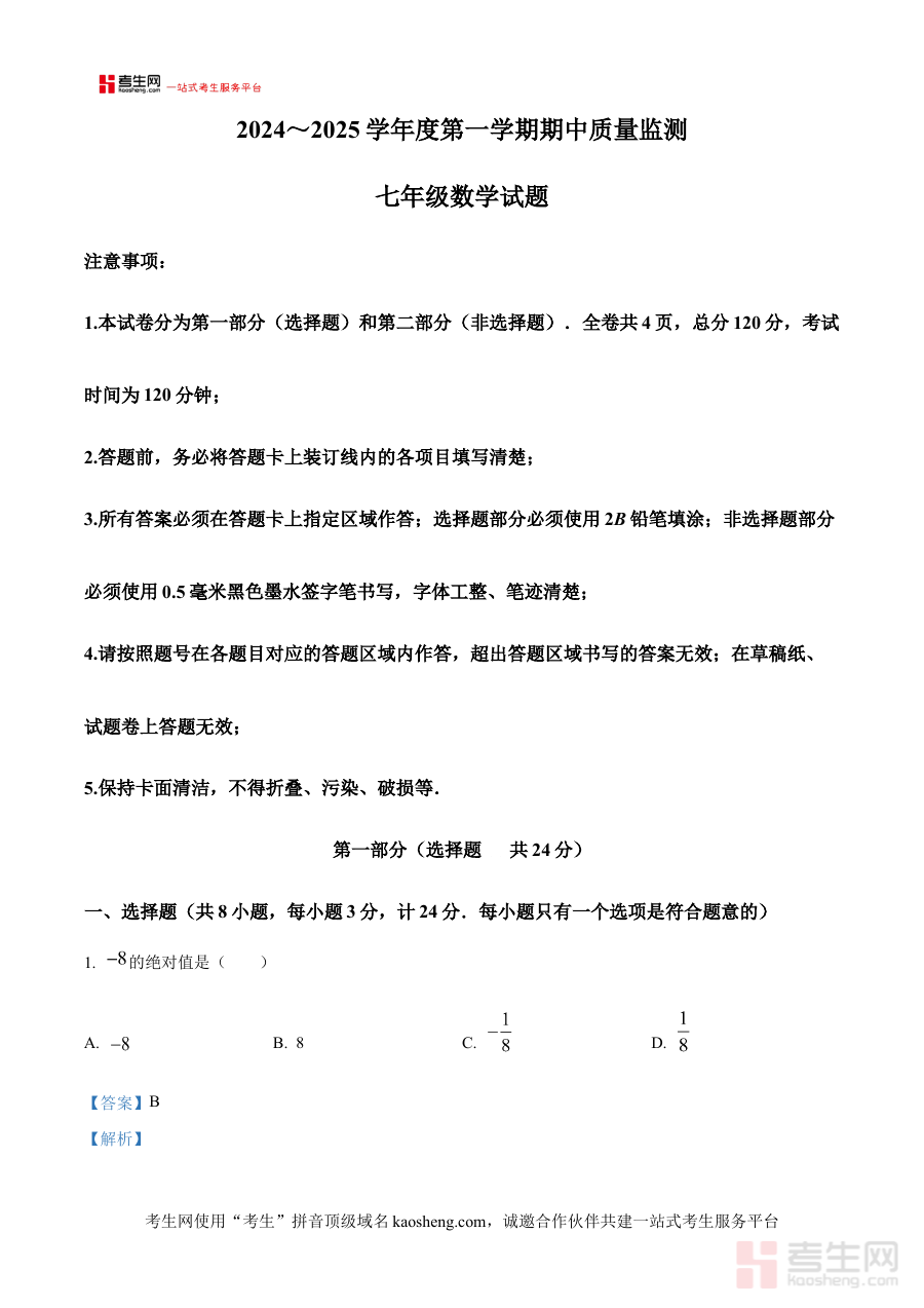 《精品解析:陕西省西安市临潼区2024-2025学年七年级上学期期中考试数学题(解析版)》是针对陕西省西安市临潼区特定区域、特定学年段与特定考试类型的数学备考资料。该资料精准对应2024-2025学年七年级上学期期中考试这一重要阶段检测节点,结合临潼区本地教学实际与考试要求,为使用者提供具有区域针对性的数学考试解析支持,助力其有效把握该阶段数学考试的核心方向与重点内容。