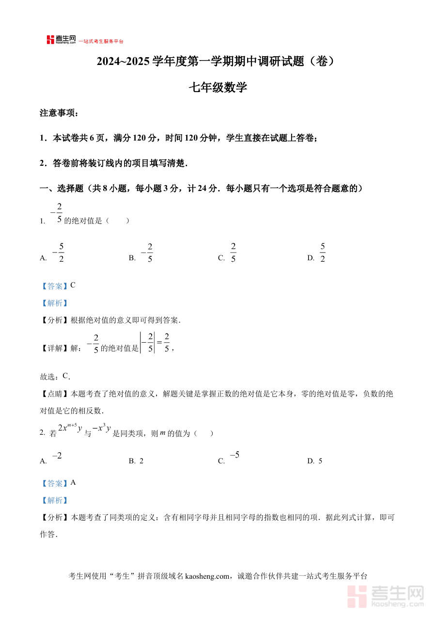 《精品解析:陕西省西安市临潼区部分学校2024-2025学年七年级上学期期中考试数学试卷(解析版)》是针对2024至2025学年陕西省西安市临潼区部分学校七年级学生上学期期中考试数学科目的专业备考资料。该资料聚焦特定地域范围内的阶段性考试需求,精准对接七年级上学期数学学习的中期检测目标,为相关使用者提供与本地教学实际紧密结合的考试参考内容,体现了对区域教学进度与考试要求的适配性。
