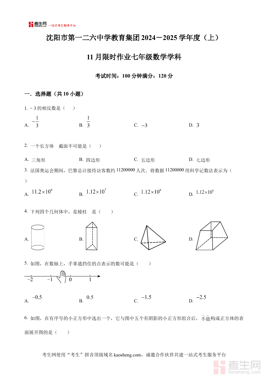 《精品解析:辽宁省沈阳市第一二六中学2024-2025学年七年级上学期11月期中测试数学试卷(原卷版)》是针对辽宁省沈阳市第一二六中学2024至2025学年七年级上学期11月期中数学测试的原卷类备考资料,包含该学校该阶段期中测试的原始试卷内容框架,能够为使用者提供与实际考试直接相关的资料支持,帮助使用者快速对接本次期中测试的核心考查场景与试卷呈现形式。
