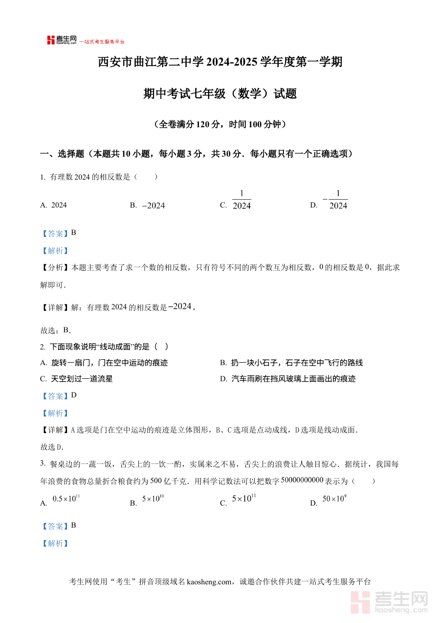《精品解析:陕西省西安市曲江第二中学 2024-2025学年七年级上学期期中考试数学(解析版)》是针对陕西省西安市曲江第二中学特定学年学期的数学期中测试所编制的专业备考资料,聚焦该学校七年级上学期数学学科期中检测的核心需求,整合了与该考试直接相关的内容解析资源,为使用者提供贴合该阶段教学进度与考试要求的参考依据,助力对期中数学考试内容的精准把握与理解,是适配该学校该阶段数学学习与检测场景的针对性资料。