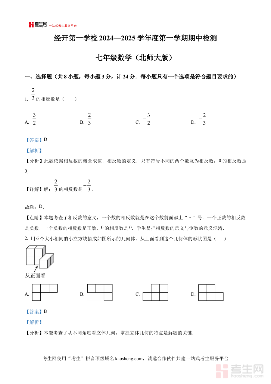 《精品解析:陕西省西安市经开第一学校2024-2025学年七年级上学期数学期中考试试题(解析版)》是聚焦陕西省西安市经开第一学校特定学段与学年数学学科期中考查需求的专业备考资料。它精准匹配该校2024至2025学年七年级上学期数学期中阶段的考试要求,结合该校教学实际情况编制而成,为相关师生提供了具有针对性的试题解析资源,是连接日常教学、阶段性复习与期中检测之间的重要桥梁。