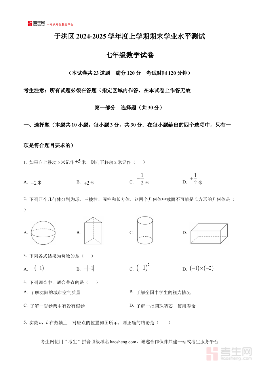 《精品解析:辽宁省沈阳市于洪区2024-2025学年七年级上学期期末学业水平测试数学试卷(原卷版)》是针对辽宁省沈阳市于洪区2024至2025学年七年级上学期期末学业水平测试的数学学科备考资料,精准匹配该地区该学年该学段的期末检测要求,为相关学习活动提供贴合本地教学实际的参考依据。