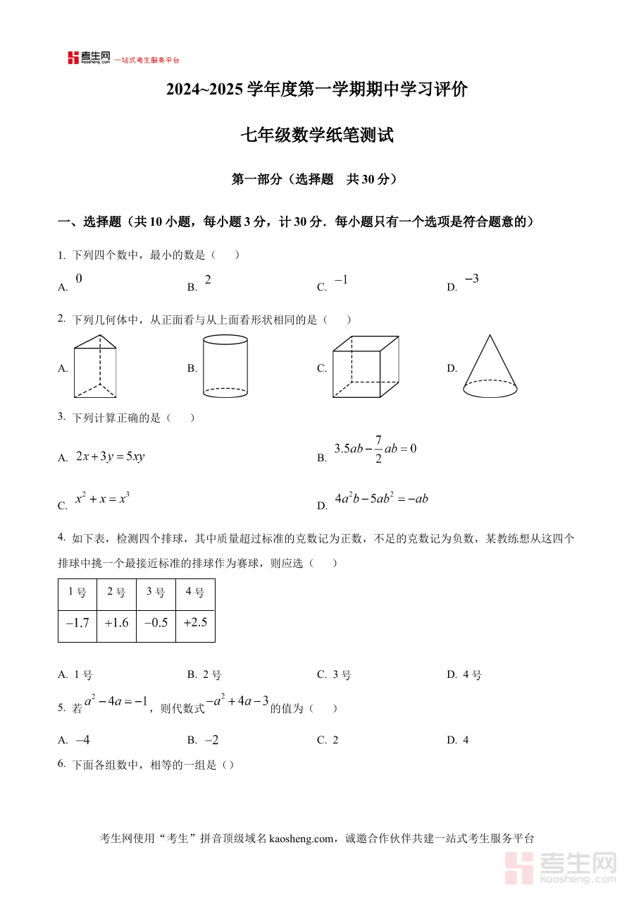 《精品解析:陕西省西安市长安区2024-2025学年上学期七年级期中数学试卷 (原卷版)》是针对陕西省西安市长安区特定学年学期的七年级期中数学考试所编制的原卷版备考资料。该资料紧密贴合长安区2024-2025学年上学期七年级数学教学进度与期中考查标准,为使用者提供与本地考试直接对应的原始试卷内容,是适配区域教育实际的阶段性学习检测资源,能帮助使用者快速对接本地考试的具体要求。