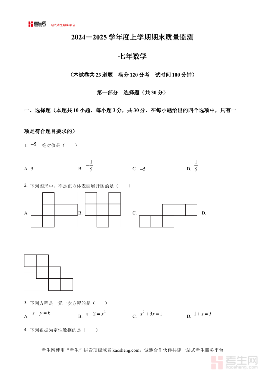 该资料的适用人群为辽宁省沈阳市铁西区2024—2025学年在读的七年级学生及担任该年级数学教学任务的教师。对于学生而言,使用原卷进行模拟练习能提前熟悉期末考试的形式、节奏及考查范围,增强应试信心与实战能力;对于教师来说,通过分析原卷可更精准地定位学生的知识盲区,调整教学重点,助力学生在期末检测中高效备考,实现阶段学业目标。