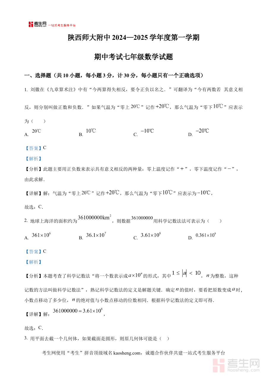 《精品解析:陕西省西安市陕西师范大学附属中学2024-2025学年七年级上学期期中考试数学试卷(解析版)》是针对陕西省西安市陕西师范大学附属中学特定学年与学段的数学期中检测而编制的专业备考资料。其核心定位是贴合该校2024至2025学年七年级上学期数学教学进度与期中命题要求,为使用者提供与校考实际高度匹配的学习支持资源,是连接日常学习与期中检测的重要桥梁,能够帮助使用者快速对接校考的考查方向与内容范围。