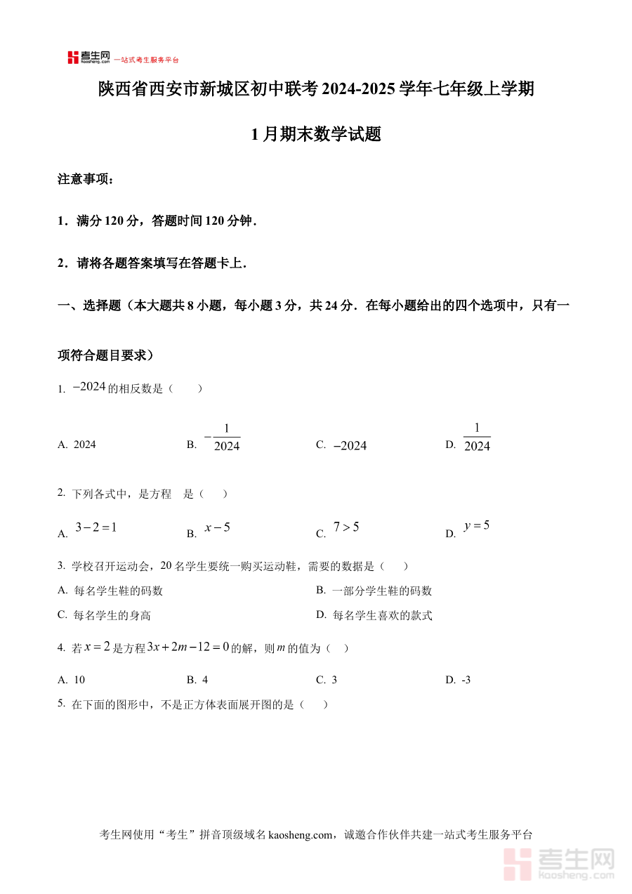 《精品解析:陕西省西安市新城区初中联考2024-2025学年七年级上学期1月期末数学试题(原卷版)》是面向陕西省西安市新城区初中联考体系设计的七年级上学期数学期末备考资料,对应2024至2025学年第一学期末的1月考试节点。该资料以原卷形式呈现,严格遵循当地初中联考的考试规范与命题导向,能够真实还原期末数学考试的整体结构与考查方向,为使用者提供与实际考试高度一致的作答载体,帮助其提前熟悉考试的流程与要求。