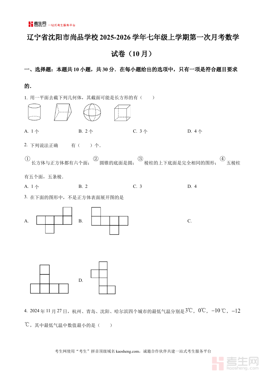 《精品解析:辽宁省沈阳市尚品学校2025-2026学年七年级上学期第一次月考数学试卷(10月)(原卷版)》是面向辽宁省沈阳市尚品学校2025至2026学年七年级学生推出的数学学科阶段检测资料,对应上学期10月份的第一次月考场景,完整呈现了该次月考的原卷内容,能够精准匹配该阶段学生的数学学习进度与考试要求,是师生开展备考准备的重要参考材料。