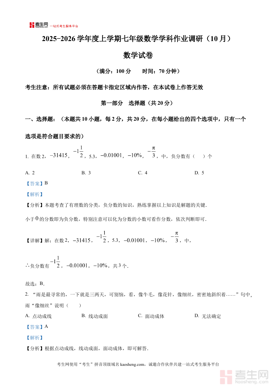 《精品解析:辽宁省沈阳市第七中学主校区2025-2026学年七年级上学期10月月考数学试题(解析版)》是针对辽宁省沈阳市第七中学主校区2025-2026学年七年级上学期10月数学月考的专项备考资料,聚焦该阶段学校内部的阶段性考试需求,为学生提供贴合本校教学进度与命题方向的参考内容。