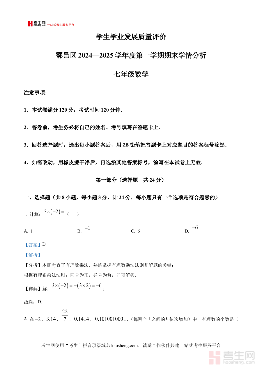《精品解析:陕西省西安市鄠邑区2024-2025学年七年级上学期1月期末数学试题(解析版)》是针对陕西省西安市鄠邑区特定区域、特定学年段与特定考试节点的数学学科备考资料。它精准对应2024至2025学年七年级第一学期1月份的期末数学考试,紧密贴合该地区初中数学教学进度与期末检测要求,为使用者提供具有区域针对性的考试参考内容,是连接本地教学实际与期末检测需求的重要桥梁。