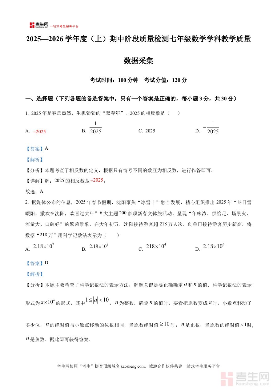 《精品解析:辽宁沈阳市实验学校2025-2026学年上学期七年级数学期中阶段试卷(解析版)》是针对辽宁省沈阳市实验学校2025-2026学年上学期七年级数学期中阶段考试的配套备考资料,聚焦该阶段数学学科的期中检测场景,为相关使用者提供与考试直接关联的解析类内容支持。