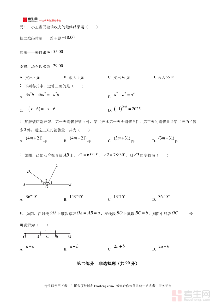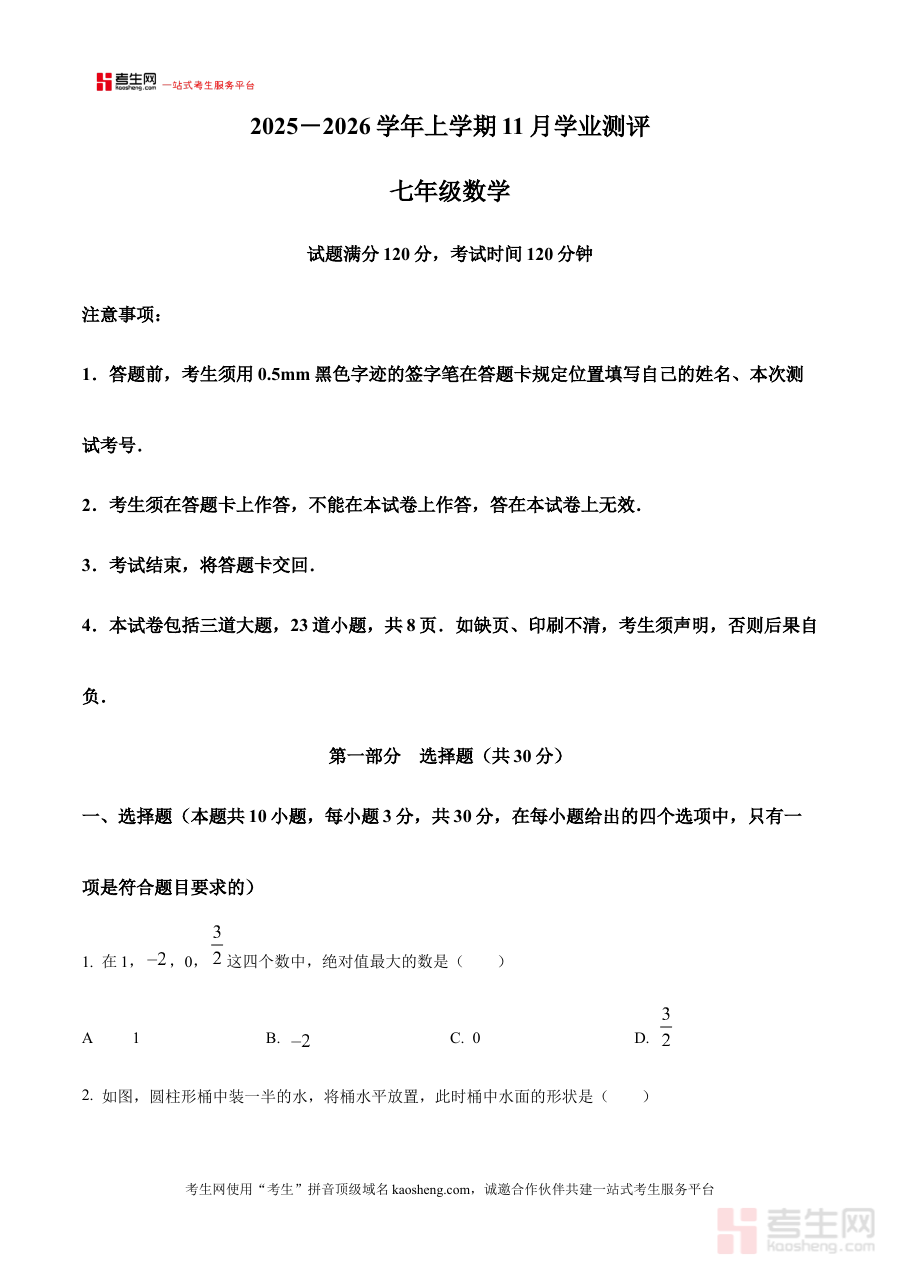 该资料作为原卷版试题资源,可用于七年级学生进行阶段性学习效果的自我检测,帮助教师或家长了解学生在数学学科上的知识掌握情况,为后续的教学调整或备考规划提供客观依据,助力使用者明确学习重点与方向。