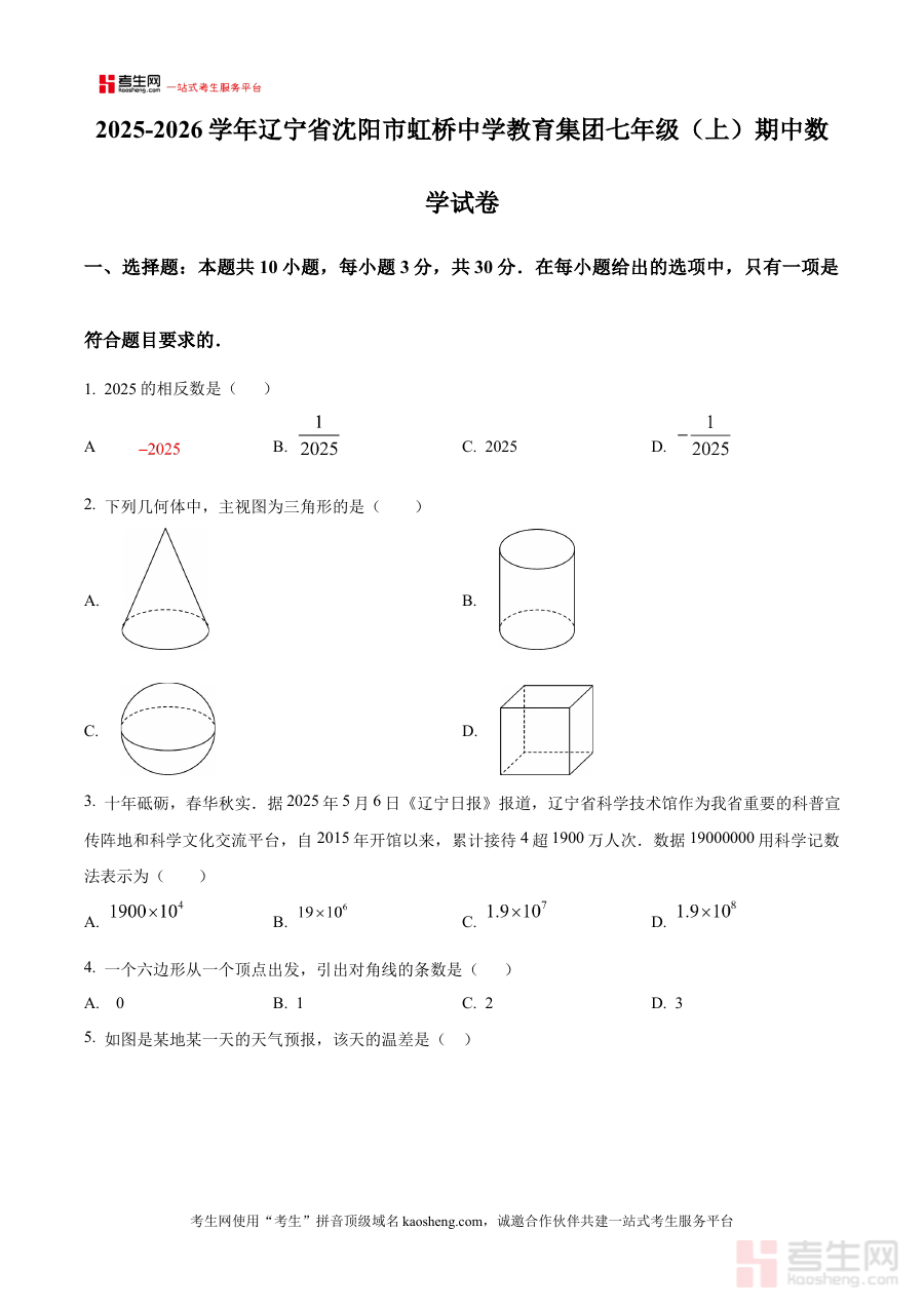 《精品解析:辽宁省沈阳市虹桥中学教育集团2025-2026学年七年级上学期期中数学试卷(原卷版)》是针对辽宁省沈阳市虹桥中学教育集团2025-2026学年七年级上学期期中数学考试的配套备考资料,聚焦该阶段数学学科的期中检测需求,为使用者提供与实际考试场景高度贴合的原卷内容。