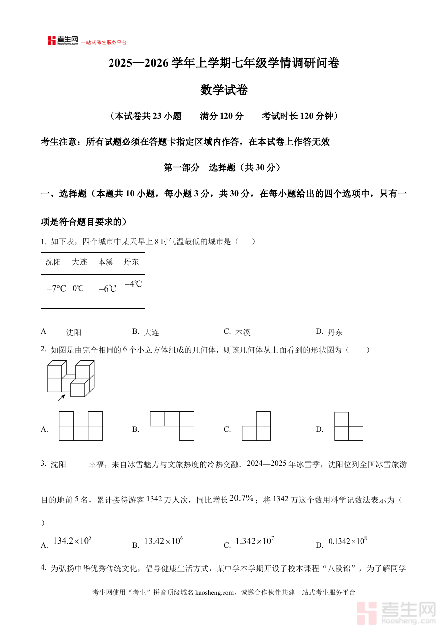 《精品解析:辽宁省沈阳市和平区2025-2026学年七年级上学期期末数学试卷(原卷版)》是针对辽宁省沈阳市和平区2025至2026学年七年级上学期数学期末考试的备考资料,聚焦该地区该学年七年级上学期的数学期末检测场景,为相关学习与教学活动提供对应考试的原始试卷参考。