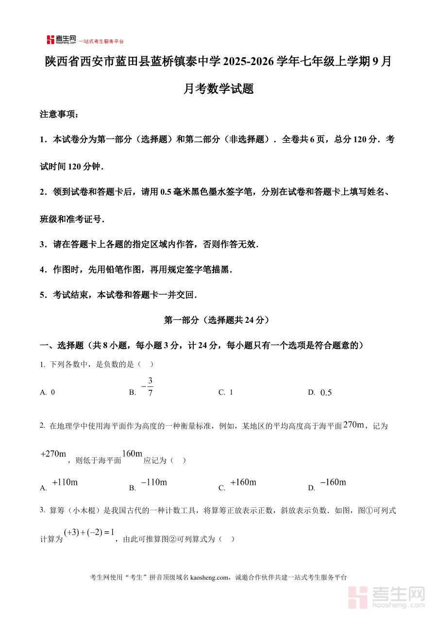 《精品解析:陕西省西安市 蓝田县蓝桥镇泰中学2025-2026学年七年级上学期9月月考数学试题(原卷版)》是针对陕西省西安市蓝田县蓝桥镇泰中学特定学年学期及月份的数学月考资料,属于原卷版形式的备考资源。该资料精准对应2025-2026学年七年级上学期9月的数学月考场景,能够为相关使用者提供与实际考试直接关联的内容载体,帮助其熟悉该次月考的呈现形式与考查方向框架,是贴合蓝桥镇泰中学七年级学生数学学习阶段需求的针对性资料。