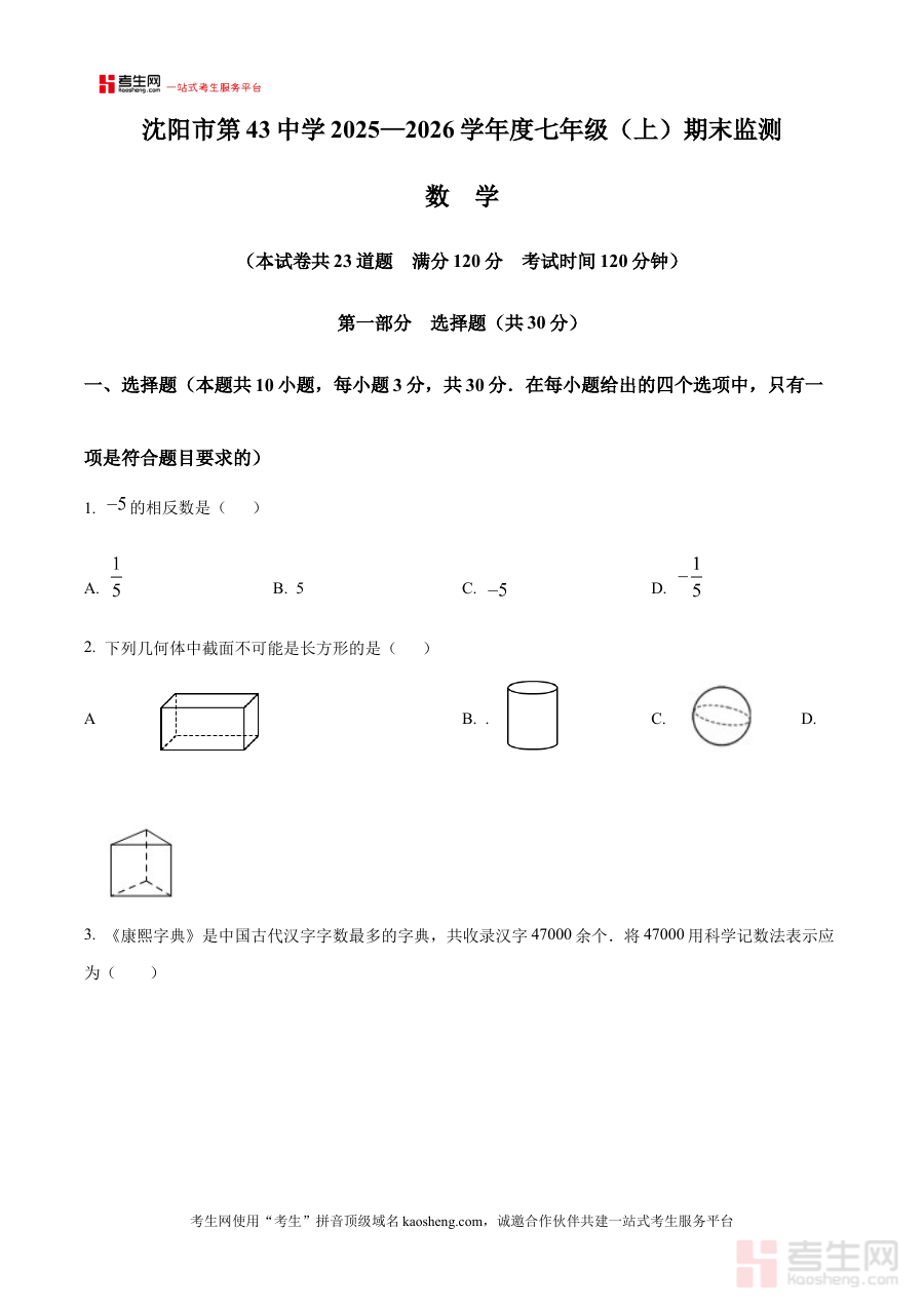 《精品解析:辽宁省沈阳市第四十三中学2025-2026学年七年级上学期期末数学试题(原卷版)》是针对辽宁省沈阳市第四十三中学2025-2026学年七年级上学期期末数学考试的备考资料,贴合该校七年级上学期数学教学进度与期末考查方向,为师生提供符合本校期末考要求的练习与参考载体。